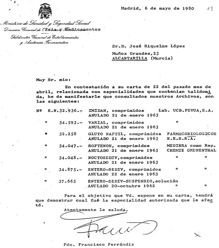 Inicio En noviembre de 2025 se han cumplido 64 años de la retirada de la Talidomida en el mundo Carta-Ministerio-Sanidad_1980